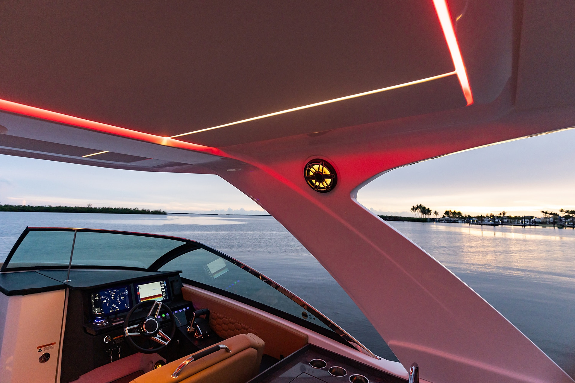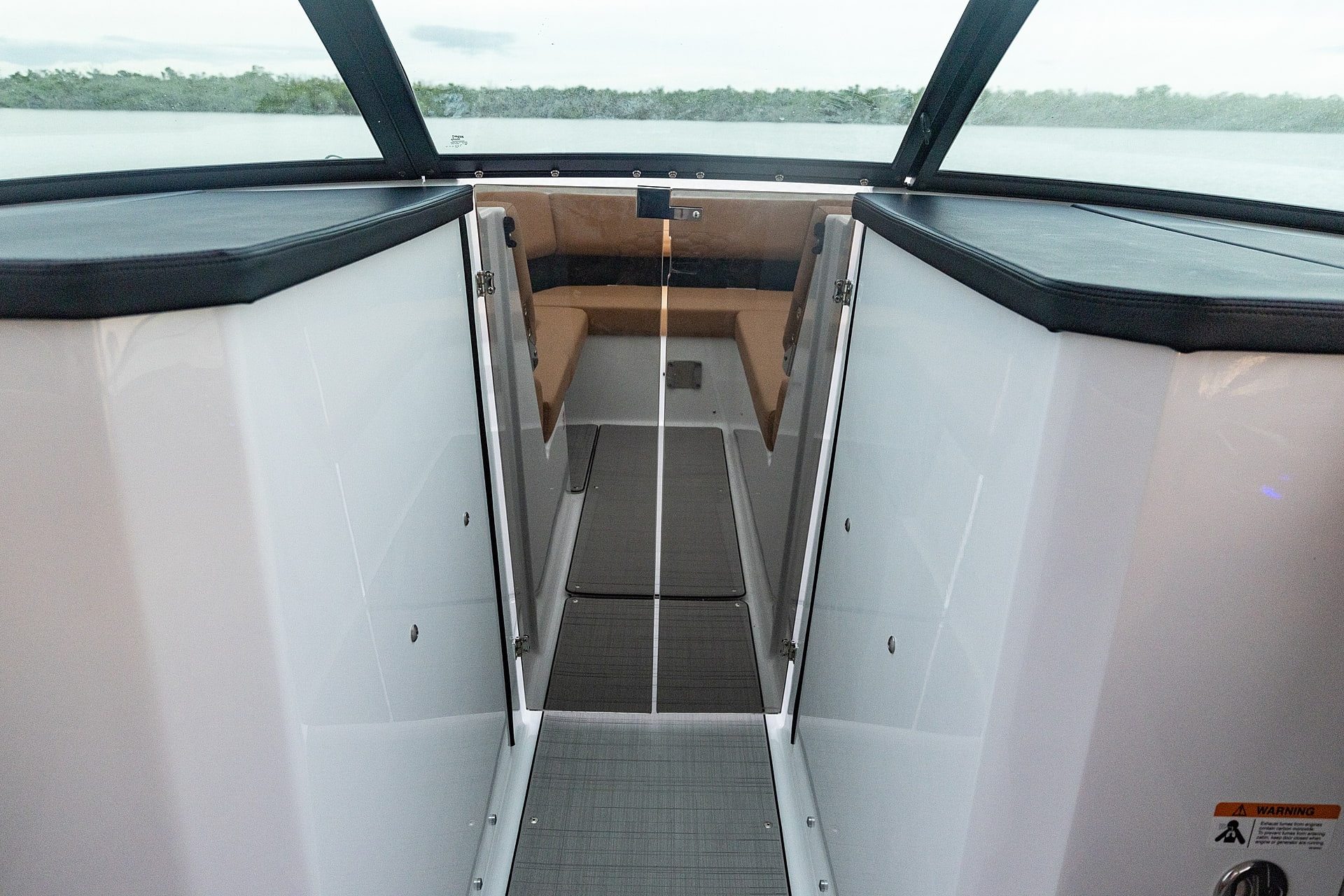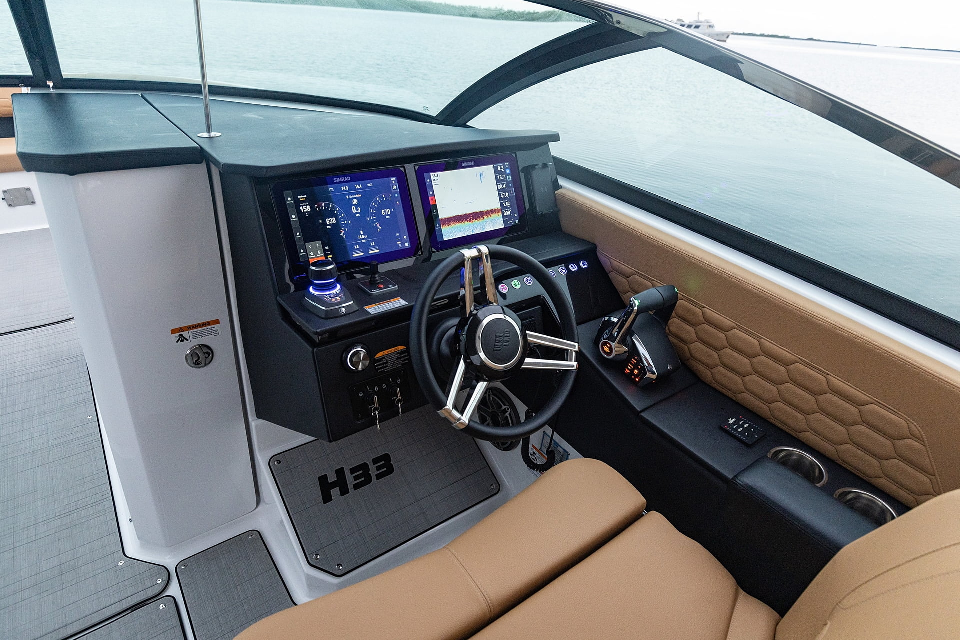 The H33 O/B is a masterclass in social versatility, highlighted by its unique switch-operated fold-down patio terraces on both port and starboard sides. This “expanded living space” design is complemented by electrically actuated forward-facing sun seats and a premium cockpit galley equipped with a sink and optional electric grill. It is a bold, modern day-boat designed for those who want to host large groups without sacrificing performance.