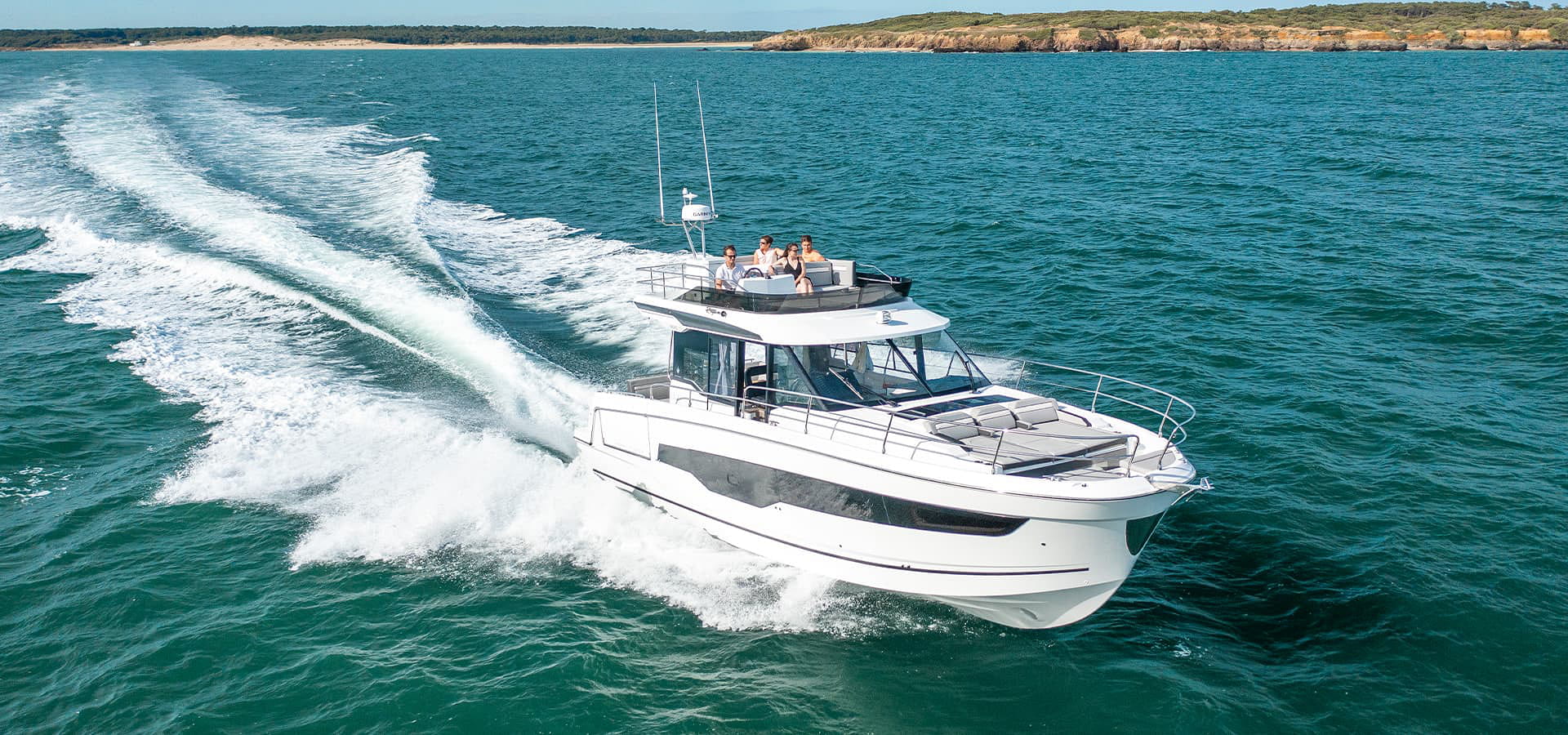 This new model features multiple living spaces especially designed for relaxation with family and friends. Plenty of time for swimming and moments with your feet dangling in the water from the aft cockpit, with the electrically controlled starboard-side terrace. Port side, a large side door facilitates access for everyone on board. Far from the everyday, you can lounge comfortably on one of three integrated sun loungers on the forward deck, for guaranteed moments of pure relaxation! Sun worshipers will enjoy the fully equipped flybridge for driving at full speed, sunbathing in complete privacy, and enjoying a cocktail with a view of the sea at the end of the day!